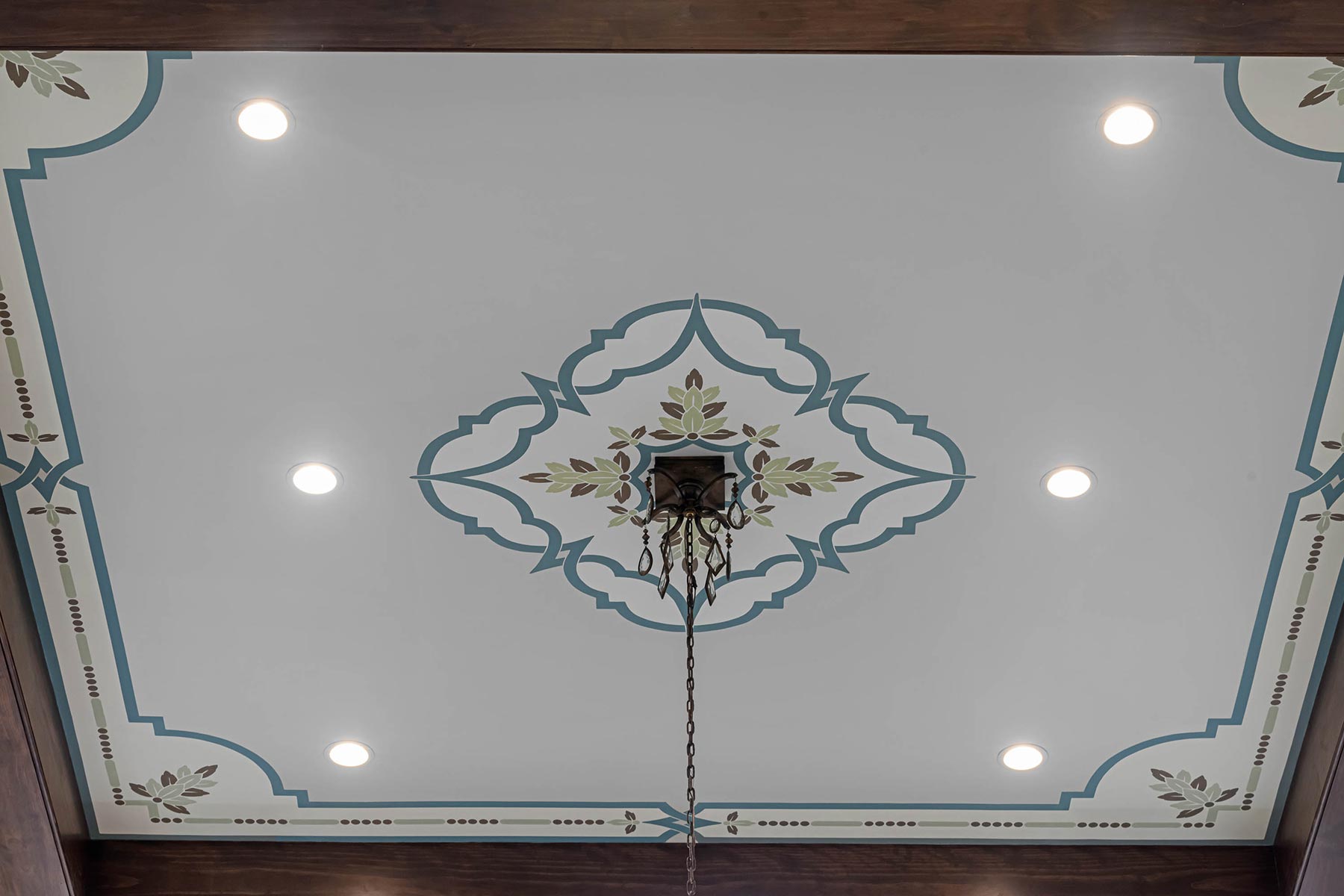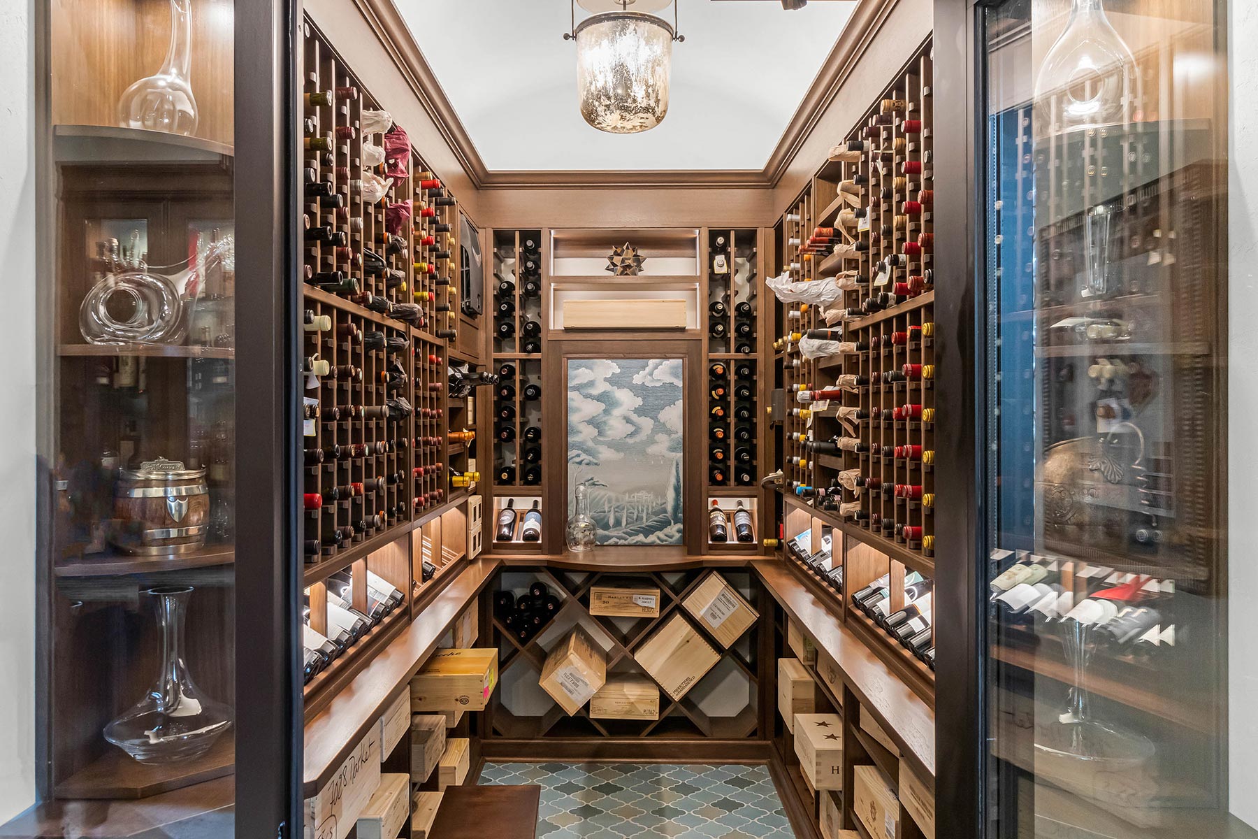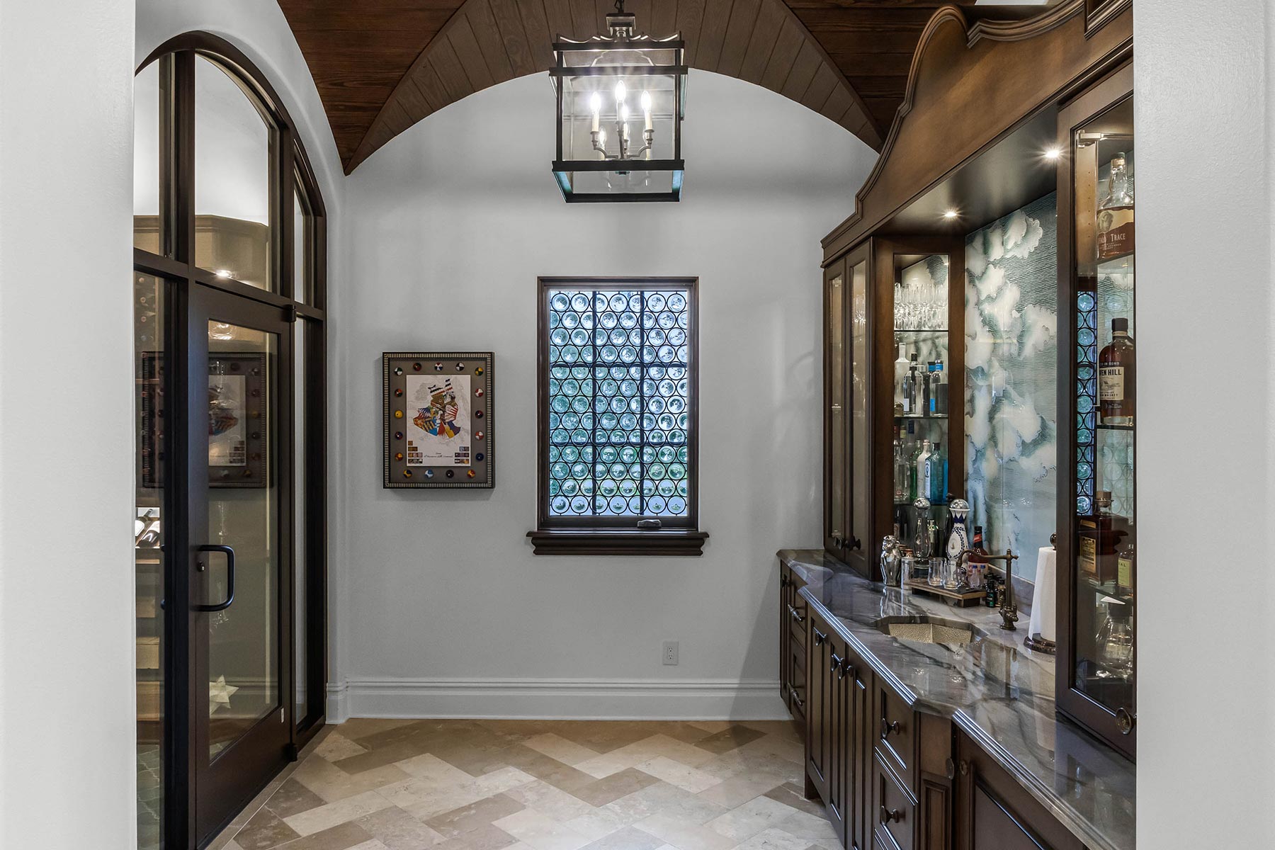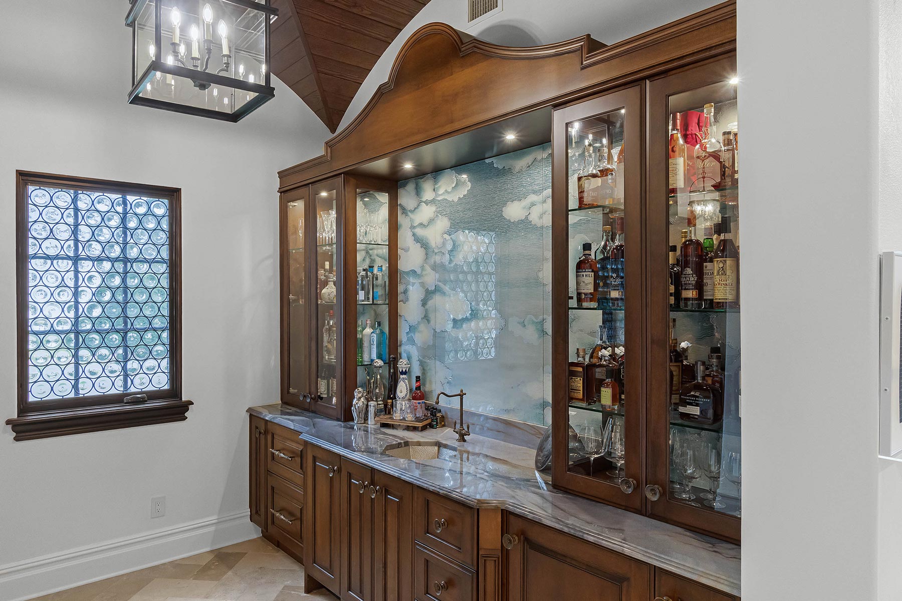 Other details involved with the renovation included a stunning wagon-wheel ceiling coffer over new dining room with hand-painted details, a whole-house audio system, a new bar & temperature controlled wine-room with custom cabinets and englameze detail on backsplash of bar and corking counter in wine room. The corking room features a custom antique window and a lounge-groove groin ceiling with a 4-way gothic arch. The staircase was fitted with a custom baluster and a curved glass window underneath that looks into a new library featuring custom built-ins.