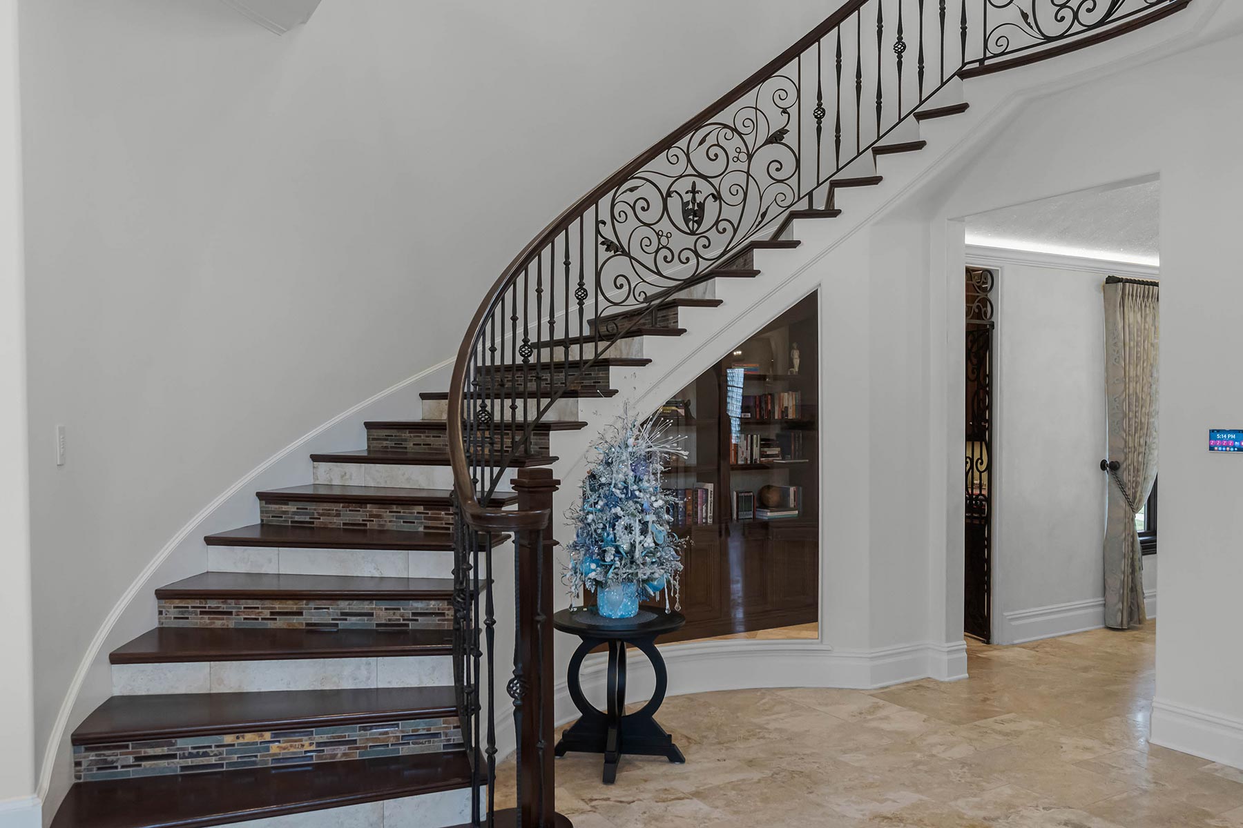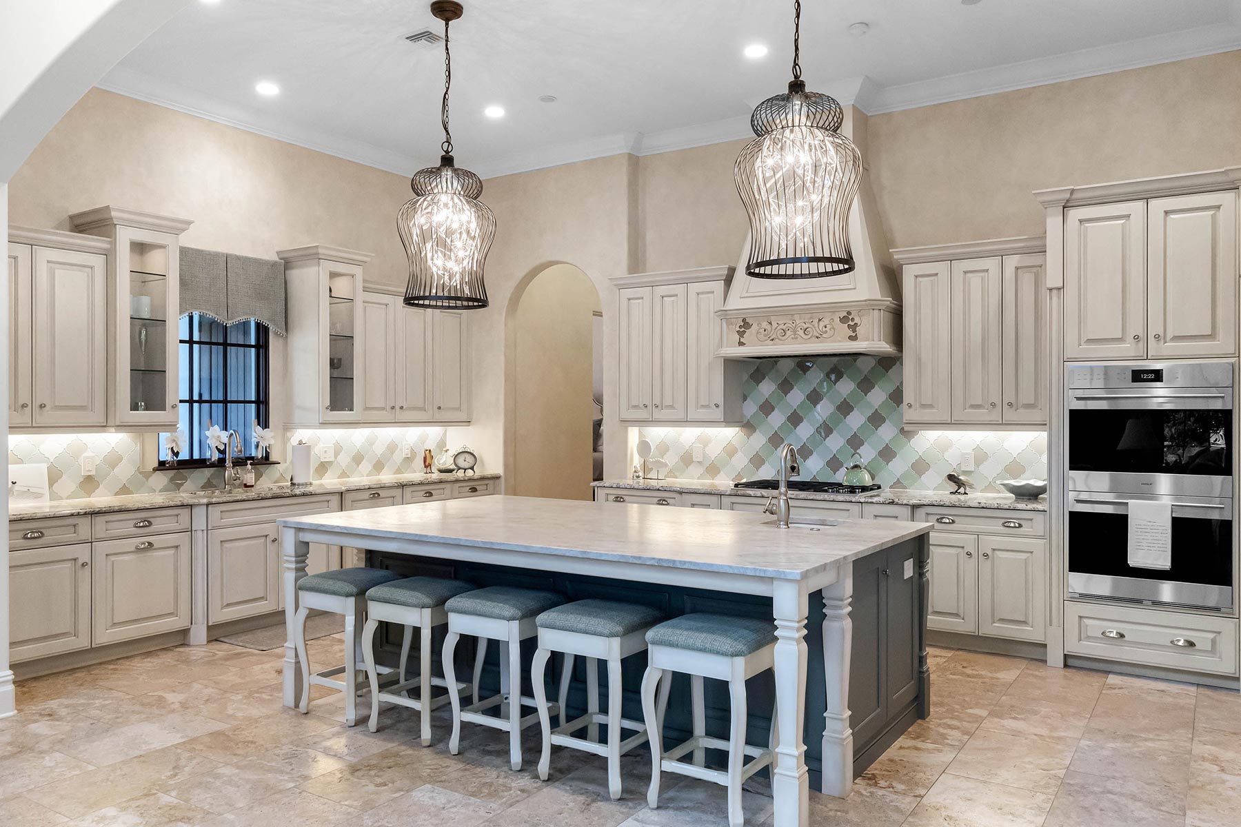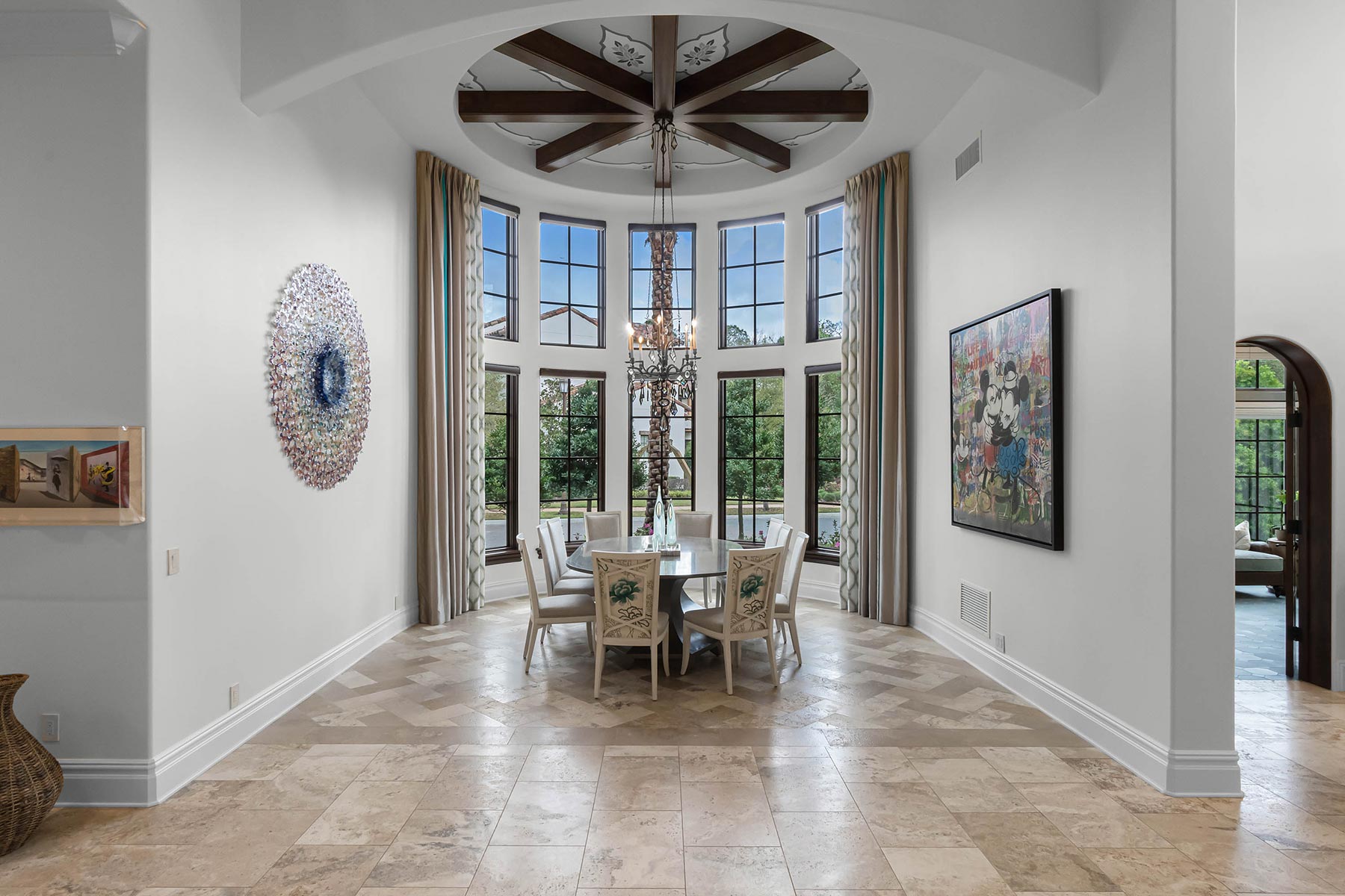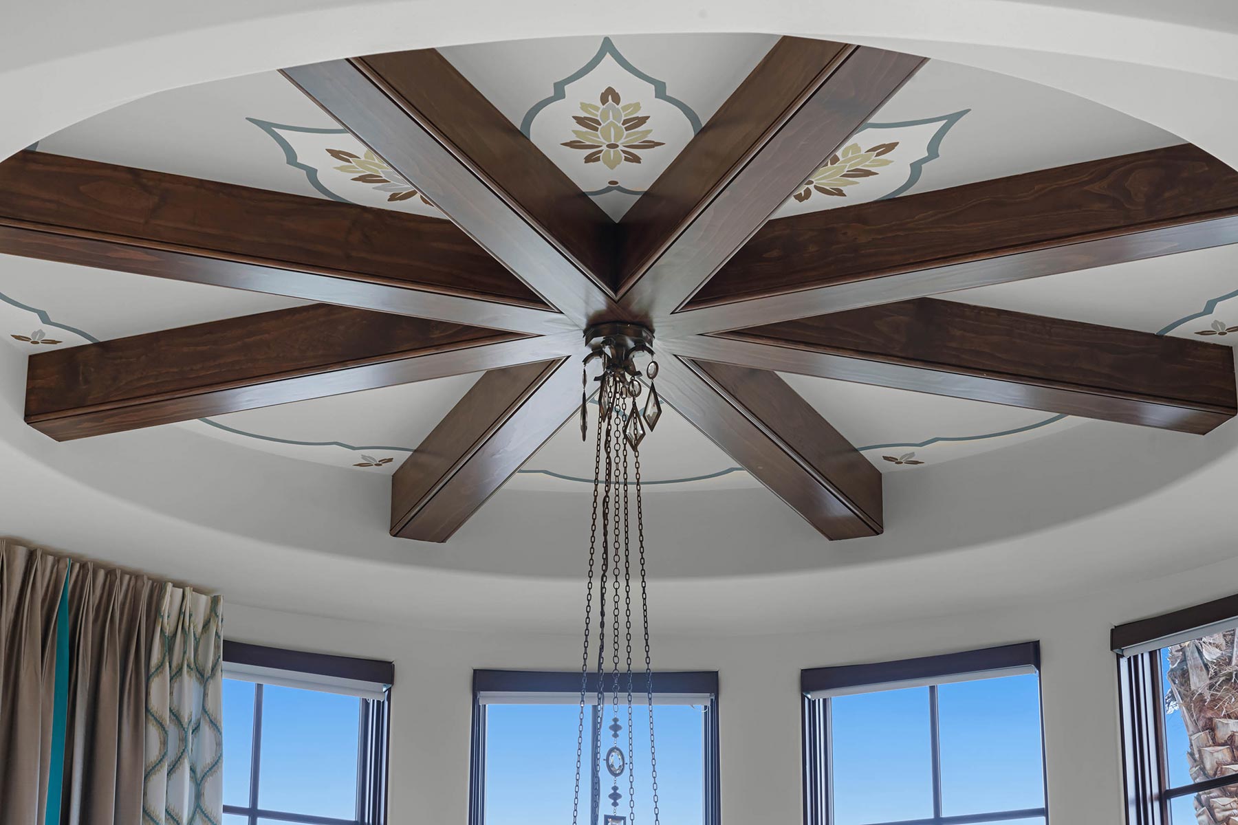 Other details involved with the renovation included a stunning wagon-wheel ceiling coffer over new dining room with hand-painted details, a whole-house audio system, a new bar & temperature controlled wine-room with custom cabinets and englameze detail on backsplash of bar and corking counter in wine room. The corking room features a custom antique window and a lounge-groove groin ceiling with a 4-way gothic arch. The staircase was fitted with a custom baluster and a curved glass window underneath that looks into a new library featuring custom built-ins.