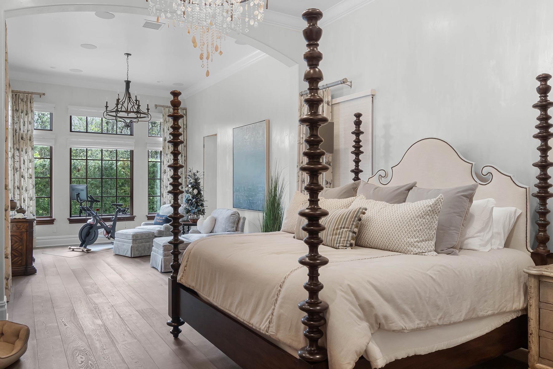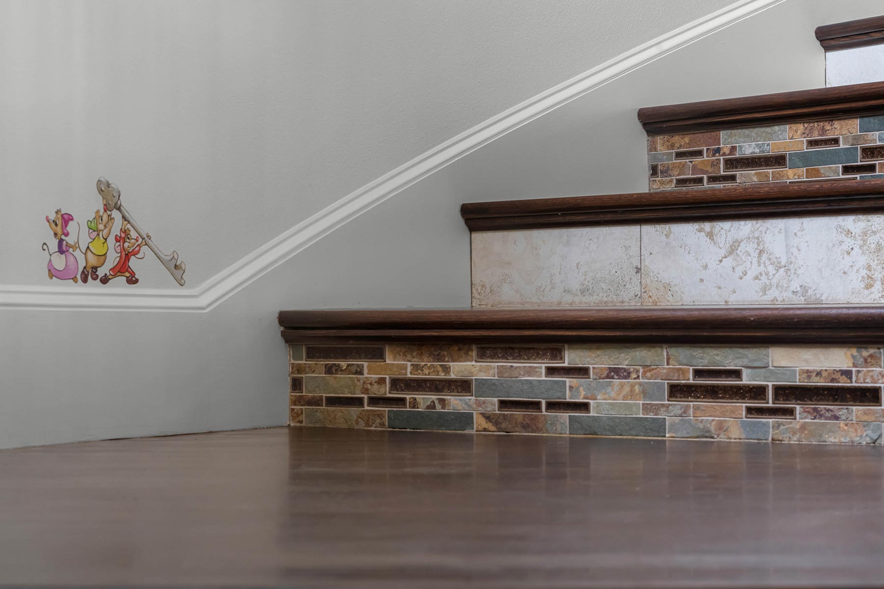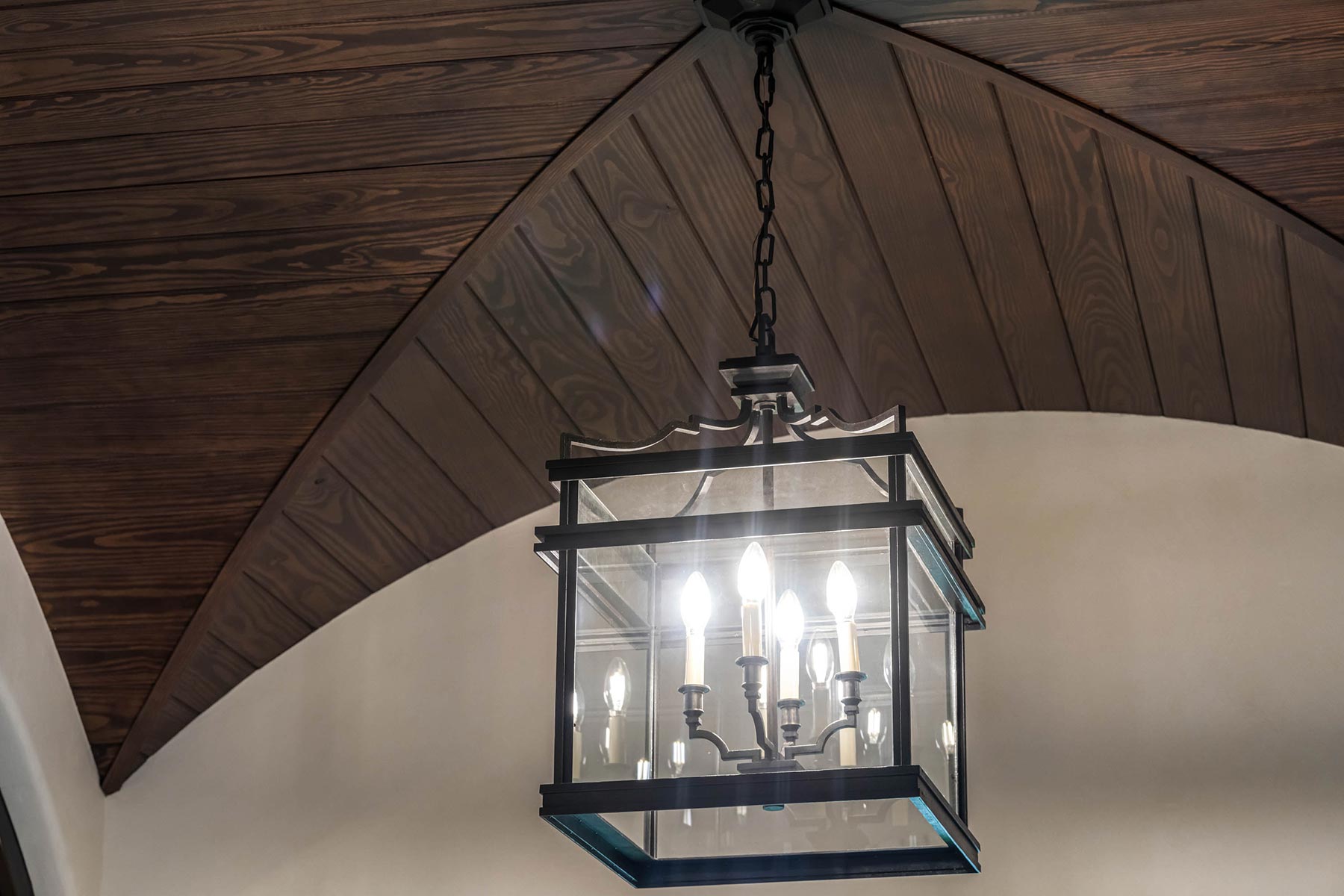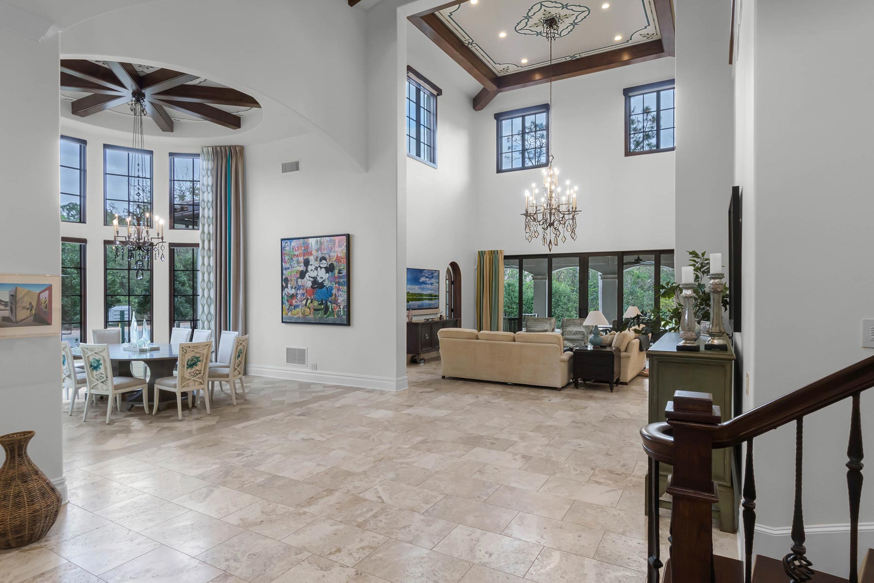 Other details involved with the renovation included a stunning wagon-wheel ceiling coffer over new dining room with hand-painted details, a whole-house audio system, a new bar & temperature controlled wine-room with custom cabinets and englameze detail on backsplash of bar and corking counter in wine room. The corking room features a custom antique window and a lounge-groove groin ceiling with a 4-way gothic arch. The staircase was fitted with a custom baluster and a curved glass window underneath that looks into a new library featuring custom built-ins.
