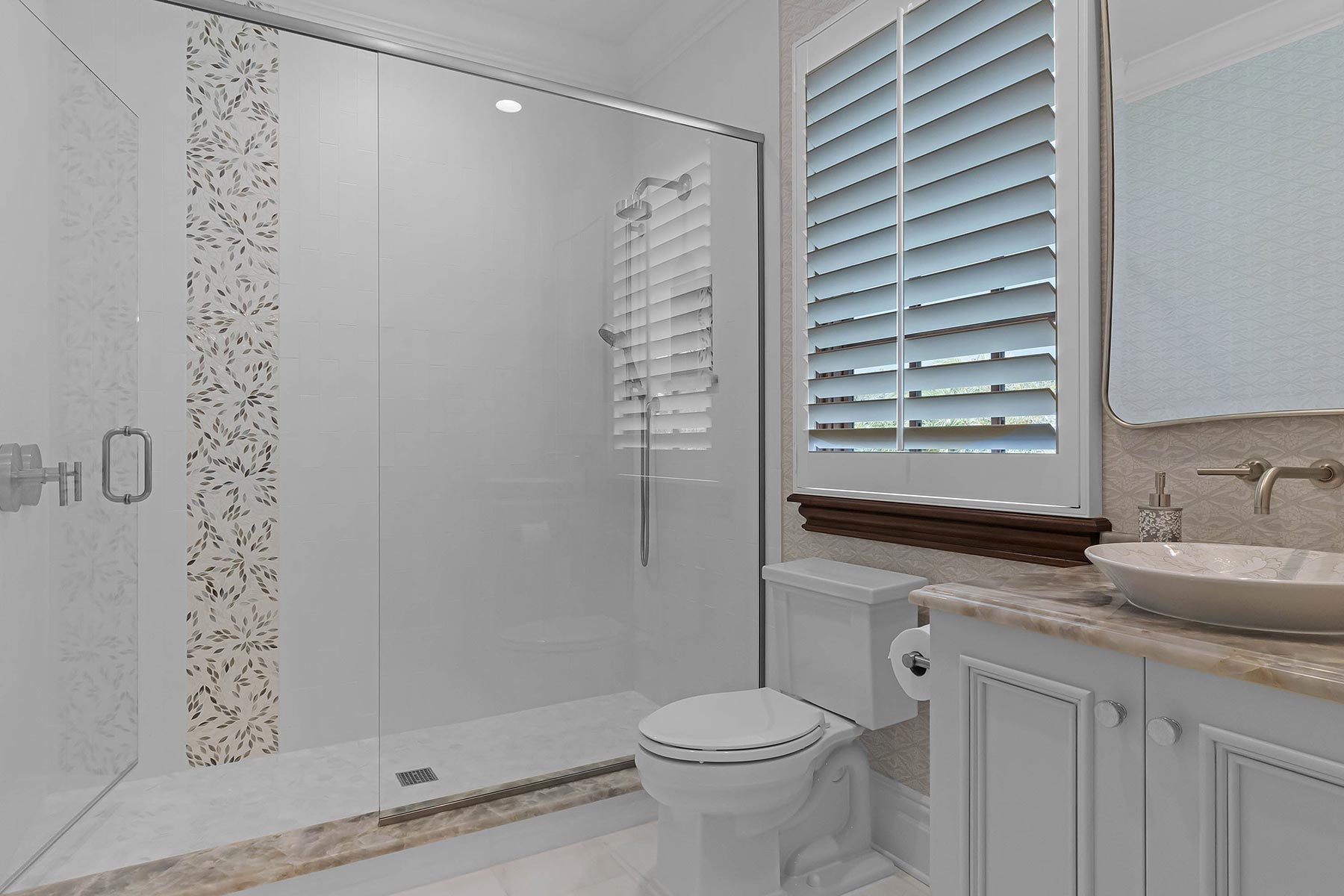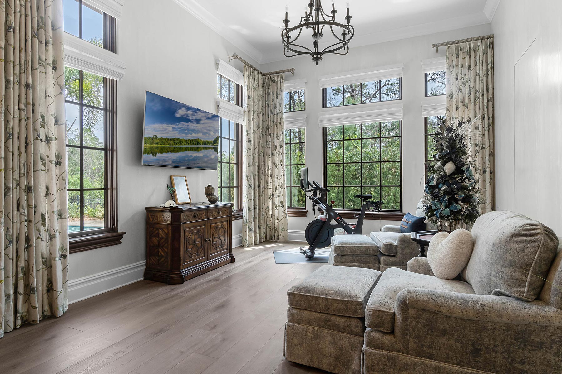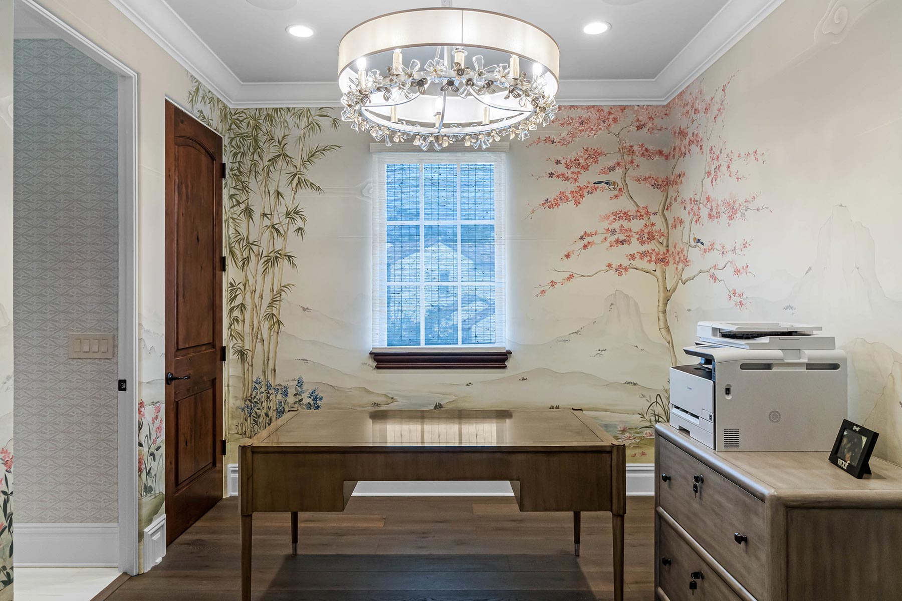 The project involved an addition of approximately 1,600 sq ft. of finished space, a new swimming pool, all new landscaping, a new sitting room off the master bedroom, beautiful new venetian plaster, and a number of details such as a hidden trimless door into the master bedroom closet. On the 2nd floor above the wine room, TotalCare built a new home office that features a biophilic hand-painted wallpaper.