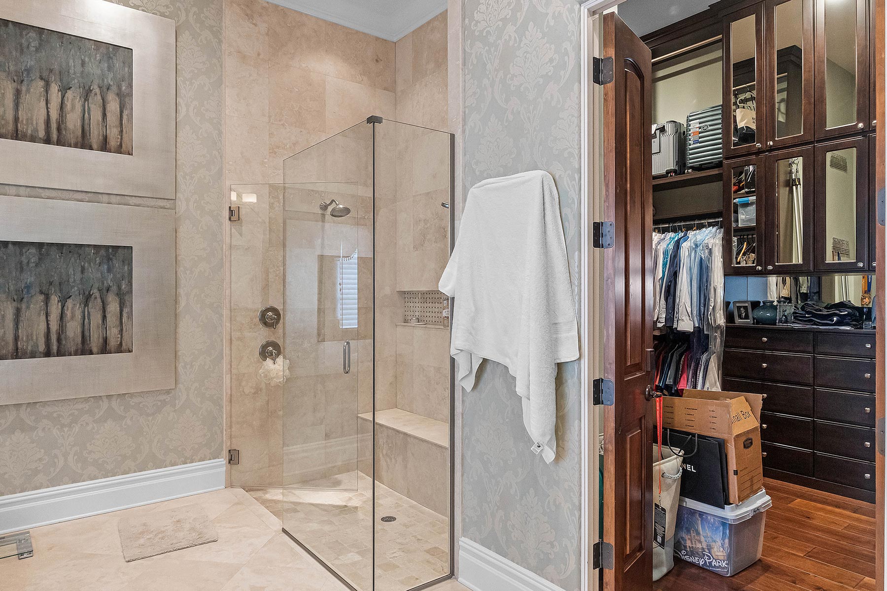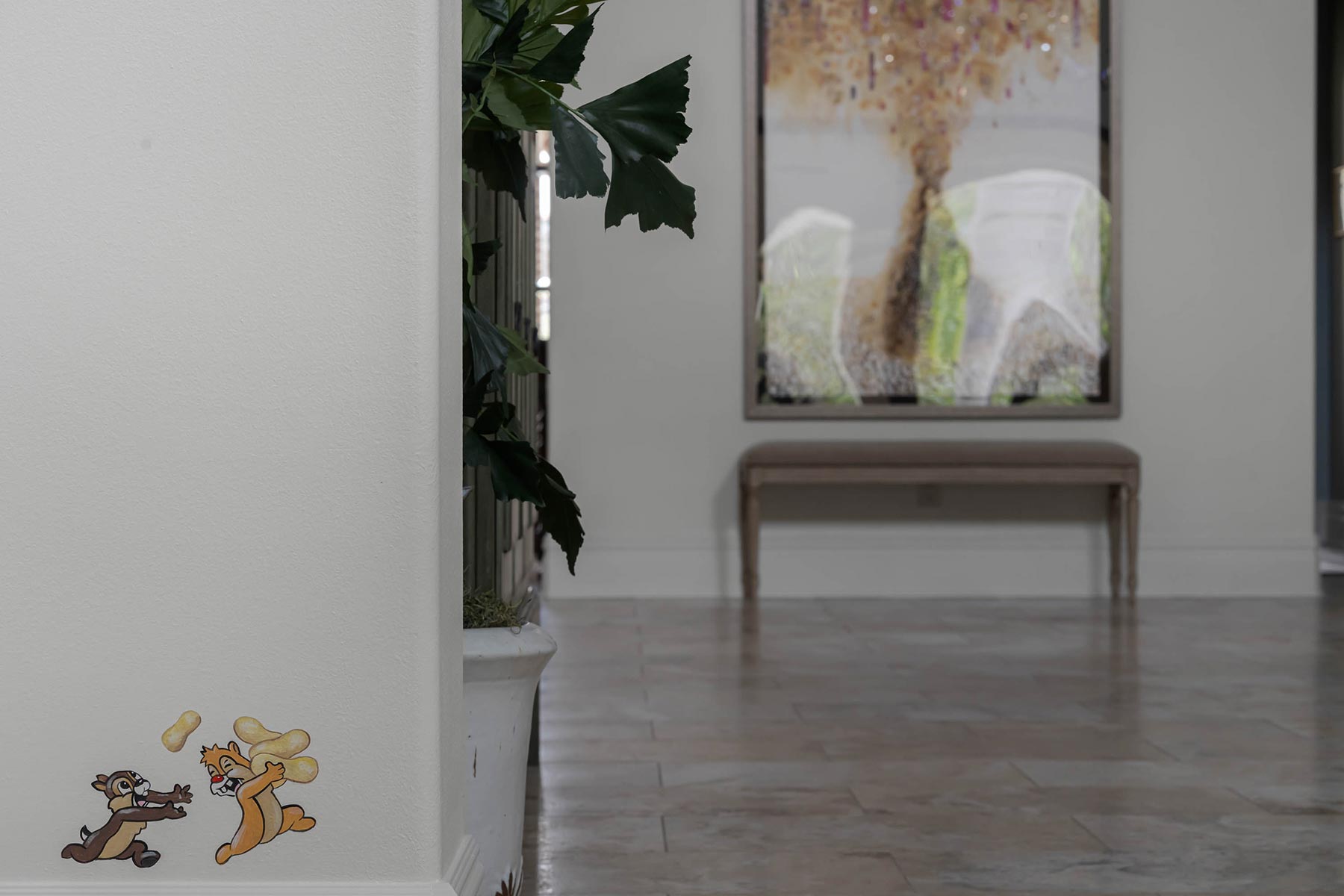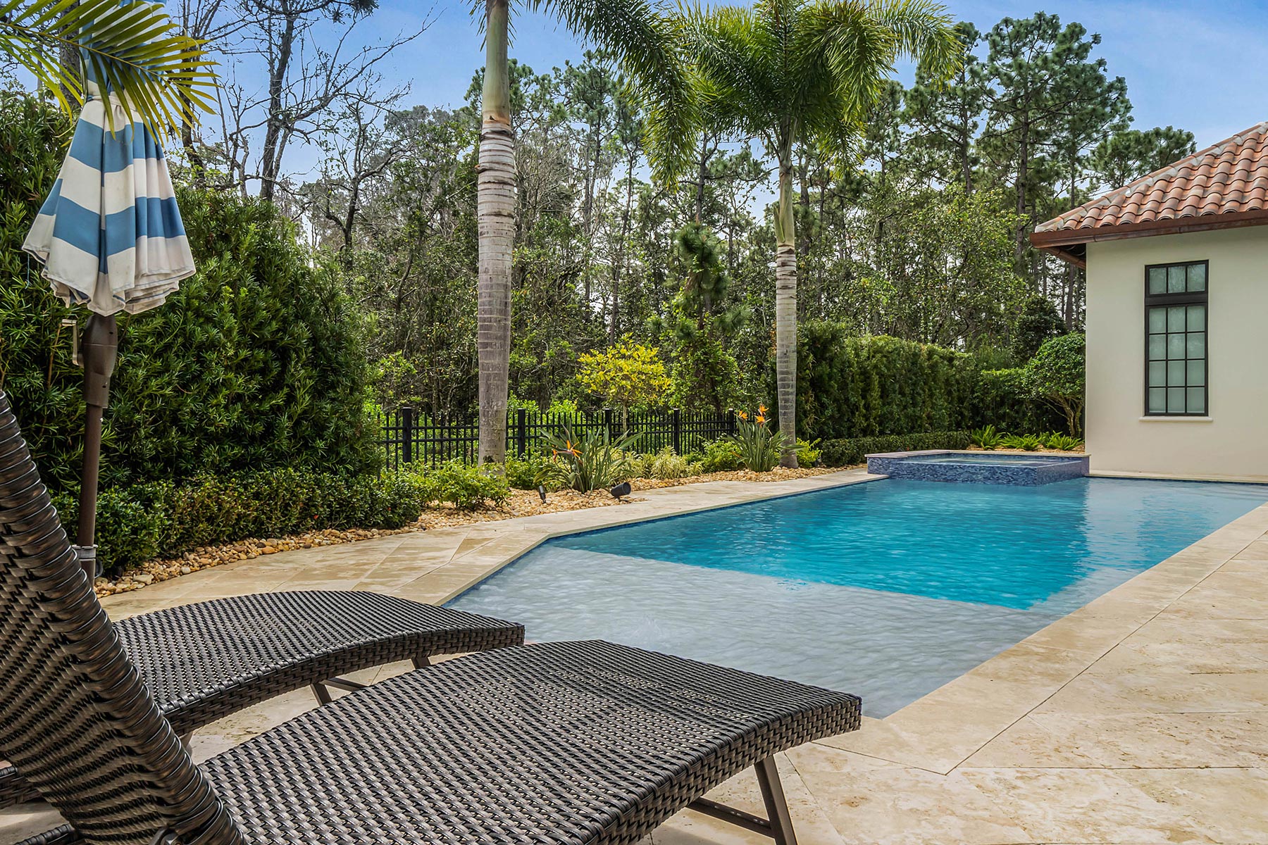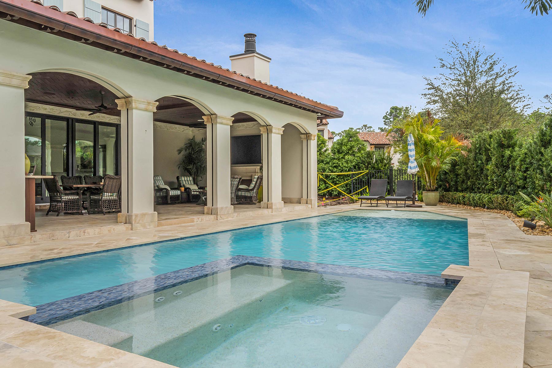 The project involved an addition of approximately 1,600 sq ft. of finished space, a new swimming pool, all new landscaping, a new sitting room off the master bedroom, beautiful new venetian plaster, and a number of details such as a hidden trimless door into the master bedroom closet. On the 2nd floor above the wine room, TotalCare built a new home office that features a biophilic hand-painted wallpaper.